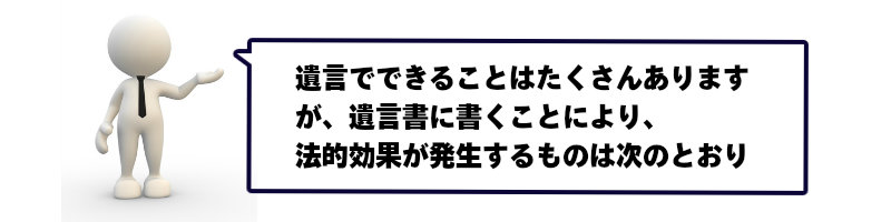 遺言が無ければできないこともある。内縁のパートナー、認知していない子供、同居している嫁や婿、世話になった友人など相続人以外の人に相続させたい場合は、必ず遺言が必要となる。